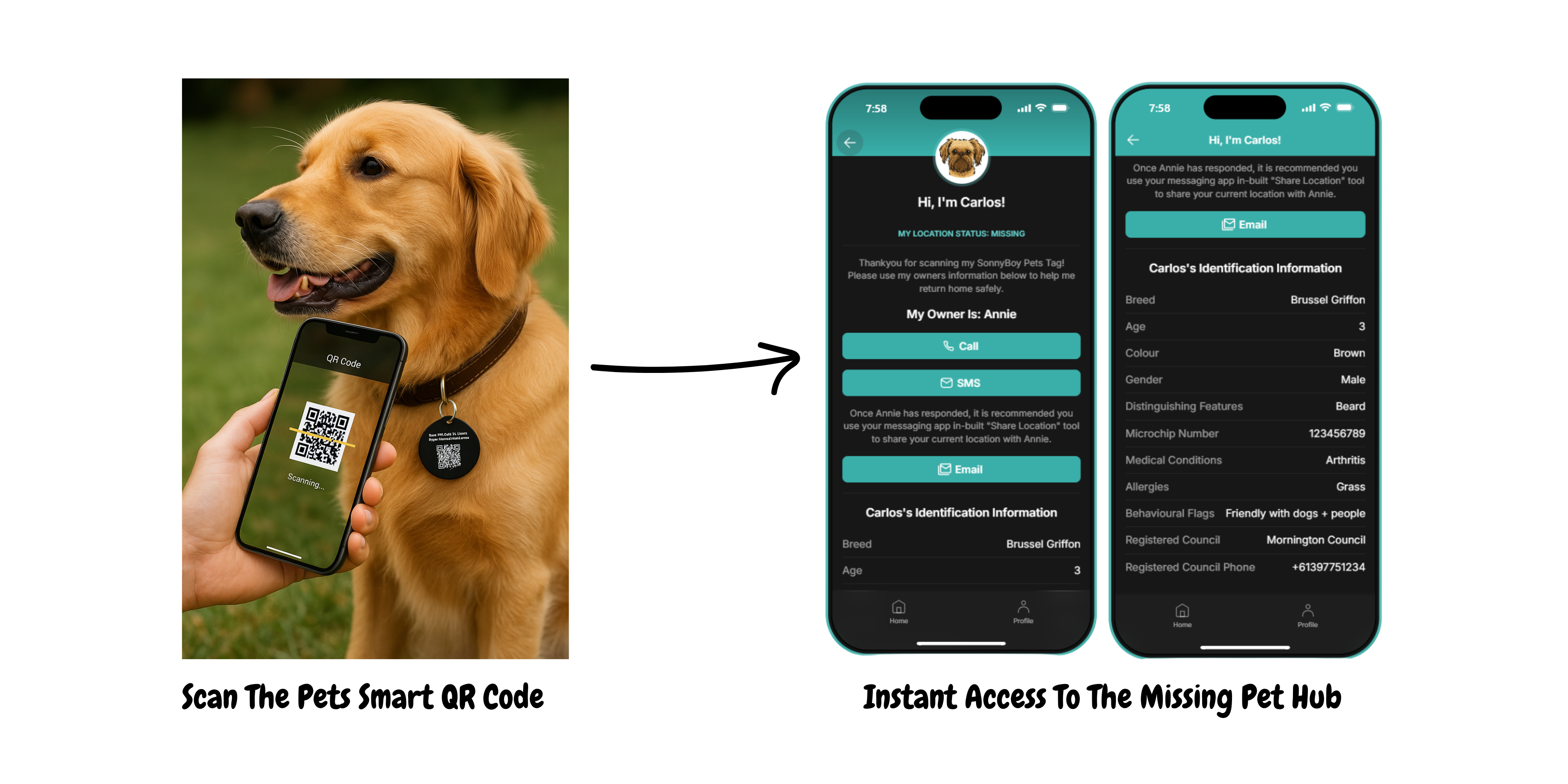 SonnyBoy Pets QR Smart Tags are powered by QR technology and connected to a powerful smart App for instant contact, location sharing, while also storing all your pets important information.